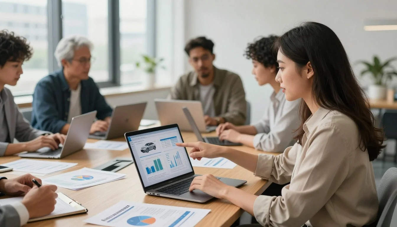 A modern office setting with two professionals sitting at a sleek desk, engaged in a discussion about auto insurance quotes. In the foreground, a laptop displays various auto insurance comparison websites, with charts and graphs visible on the screen. The middle ground features a stack of paperwork and a calculator, symbolizing financial planning. In the background, large windows let in plenty of natural light, creating a warm, inviting atmosphere. The professionals are dressed in smart business attire, portraying a serious yet approachable mood. Soft focus on the background highlights the professionals and the laptop, drawing attention to their conversation, emphasizing efficiency and budget-saving strategies. Bright, clear lighting enhances the clarity of the scene.